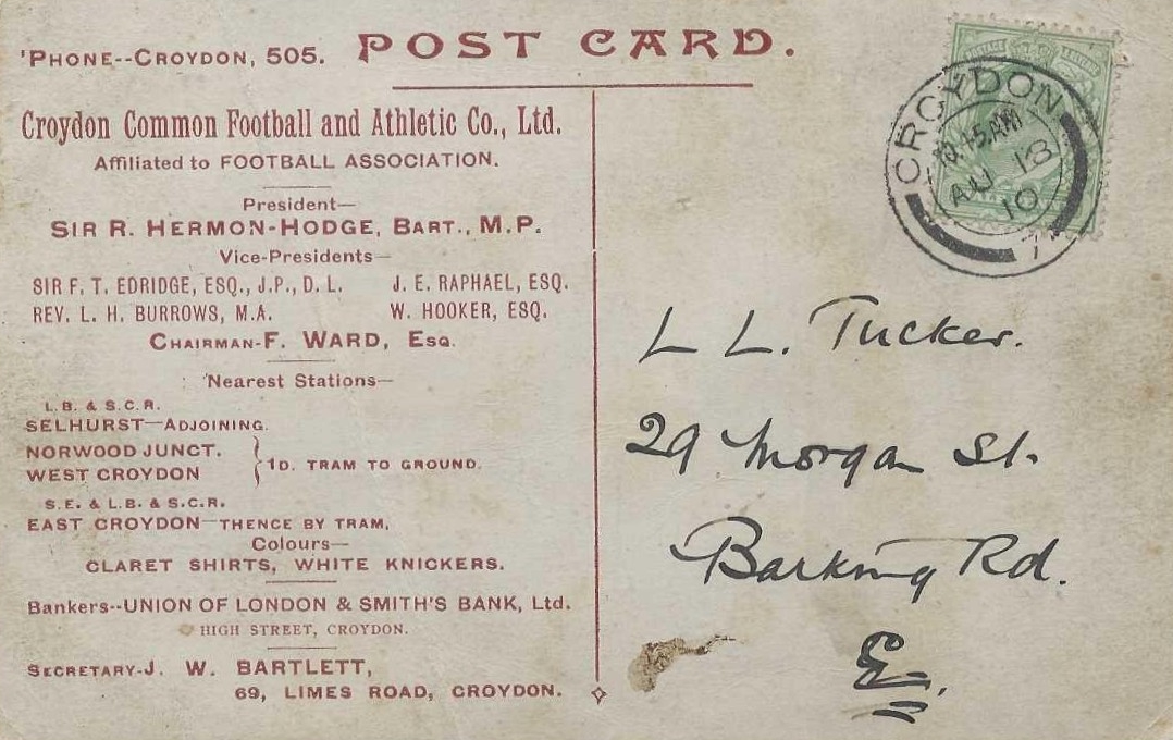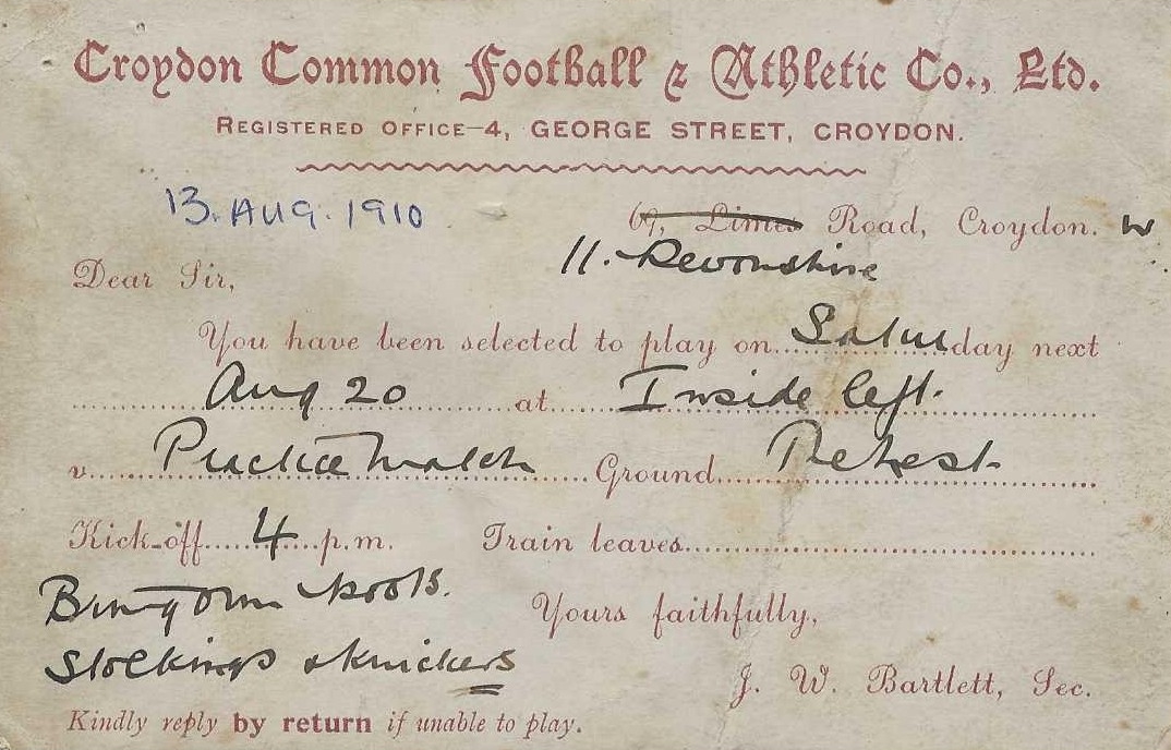 A postcard celebrating the match between Croydon Common and a Southern